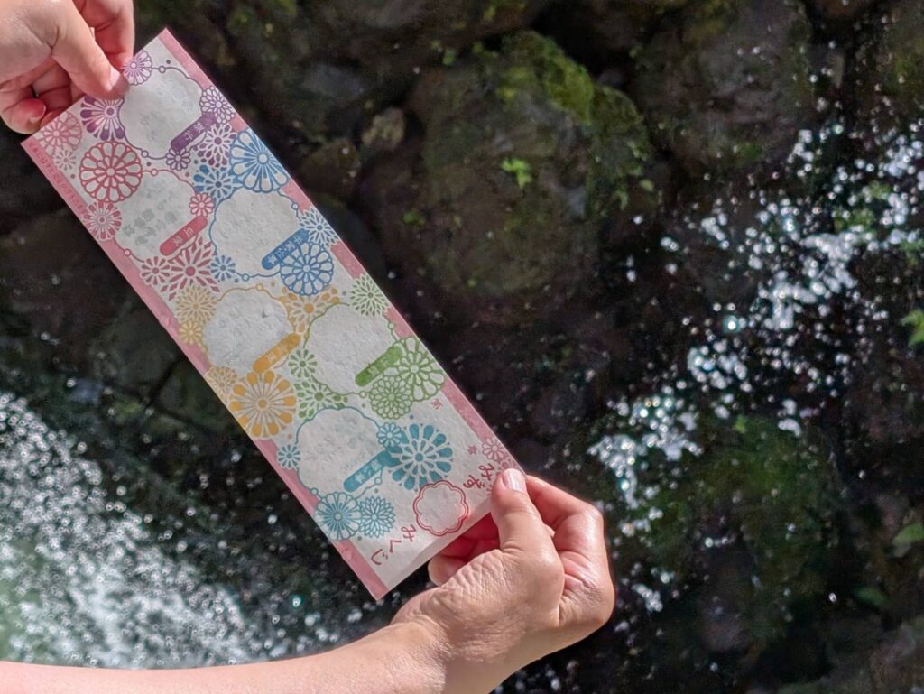 初穂料を払い、箱から水みくじを取り出し、霊水場の場所と同じところで、水みくじを水に浮かべると文字が浮き出てくるのでした。